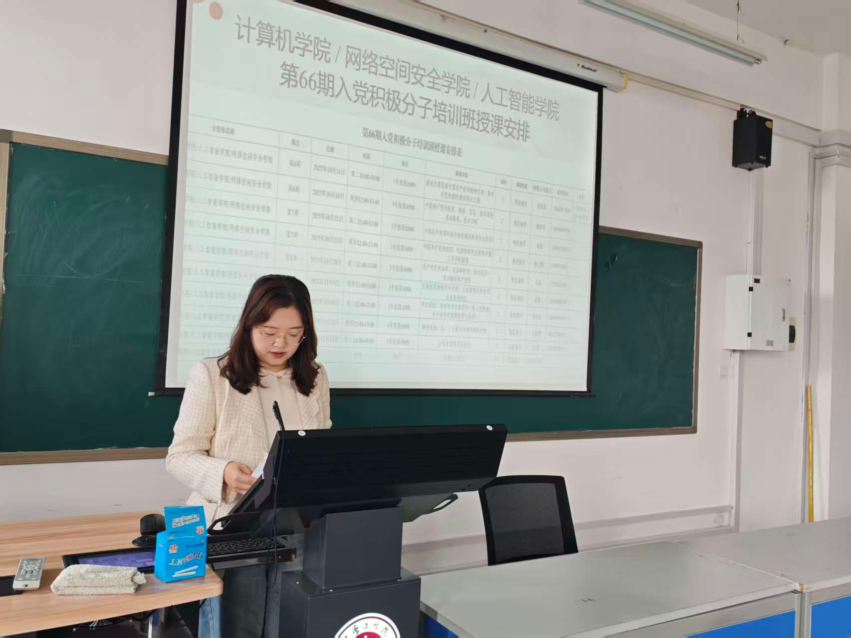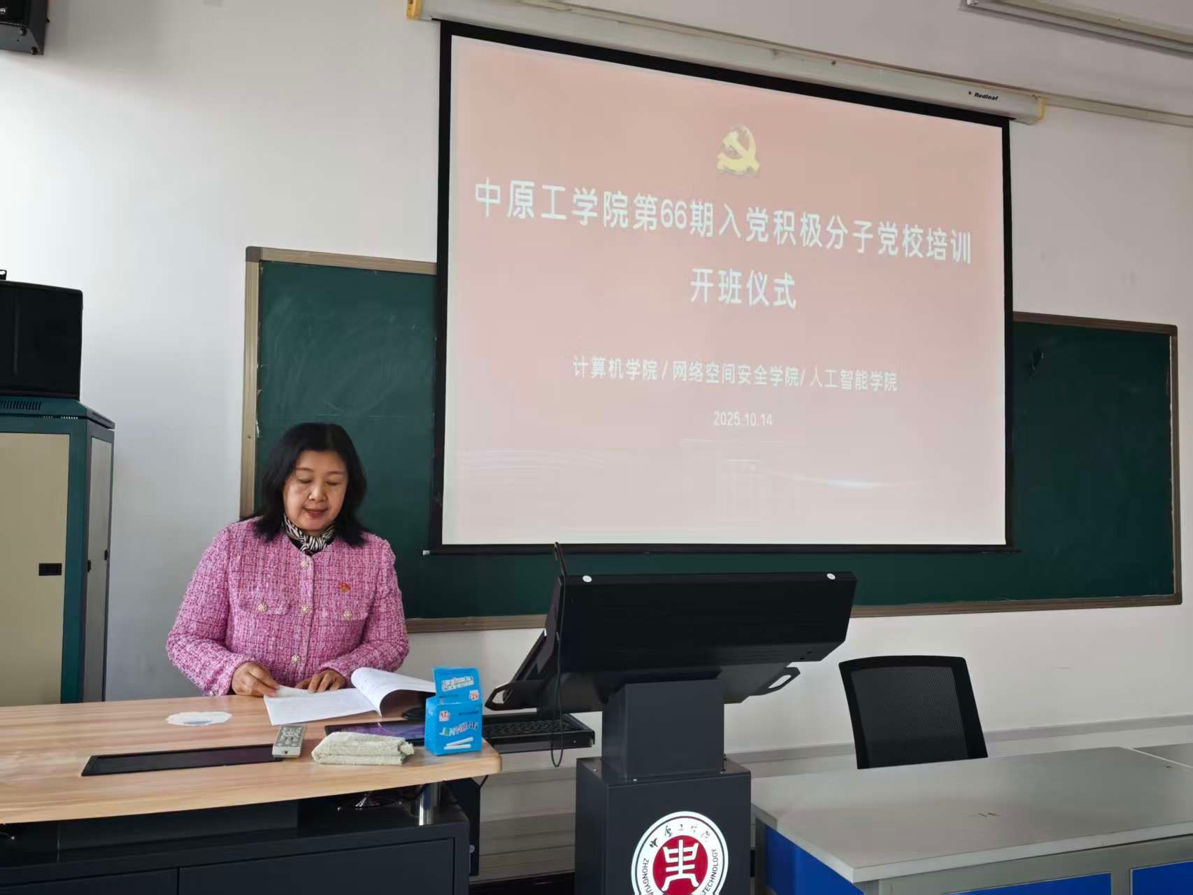 2025年10月14日下午,计算机学院、网络空间安全学院与人工智能学院联合举办的第66期入党积极分子党课培训班开班仪式在三号组团A908教室隆重举行。计算机学院党委书记苗凤君、网络空间安全学院党总支副书记邢颖、人工智能学院直属党支部副书记张志鹏,计算机学院党委副书记侯向花出席本次活动,相关学院各学生党支部书记及第66期全体学员参加活动。开班仪式由计算机学院党委副书记侯向花主持。