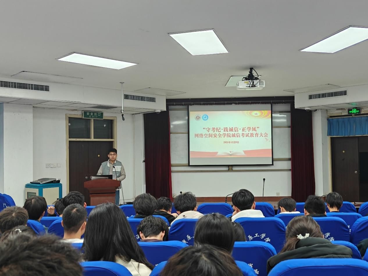 为强化学生诚信应考意识,营造公平公正的考风考纪,网络空间安全学院于12月9日在4号教学楼311报告厅开展诚信考试教育大会,学院全体本科生参会。大会由学工办副主任郭政良主持。
