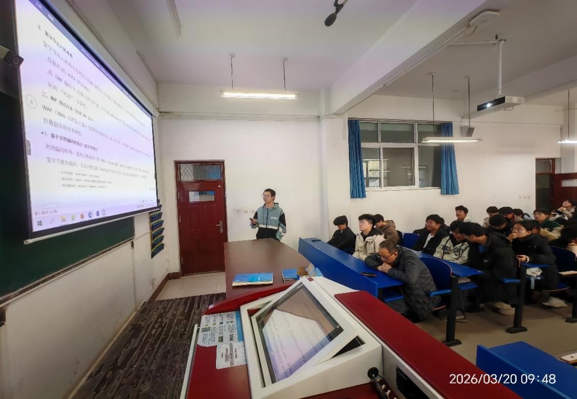 为进一步涵养学生科创素养,明晰专业发展路径,锚定学业奋进方向。网络空间安全学院于3月20日上午9时,在二号组团楼108教室开展了学科竞赛学习交流分享会。学院党支部副书记、副院长邢颖,实验室教师刘济宗及全体大一学生参加。会议由实验室教师曲晓东主持。
